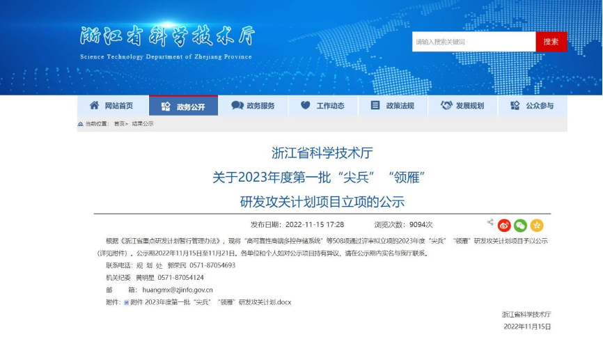 根据《浙江省重点研发计划暂行管理办法》,近日,浙江省科学技术厅公布了2023年度尖兵领雁研发攻关计划立项名单,公司申报的项目获批立项。