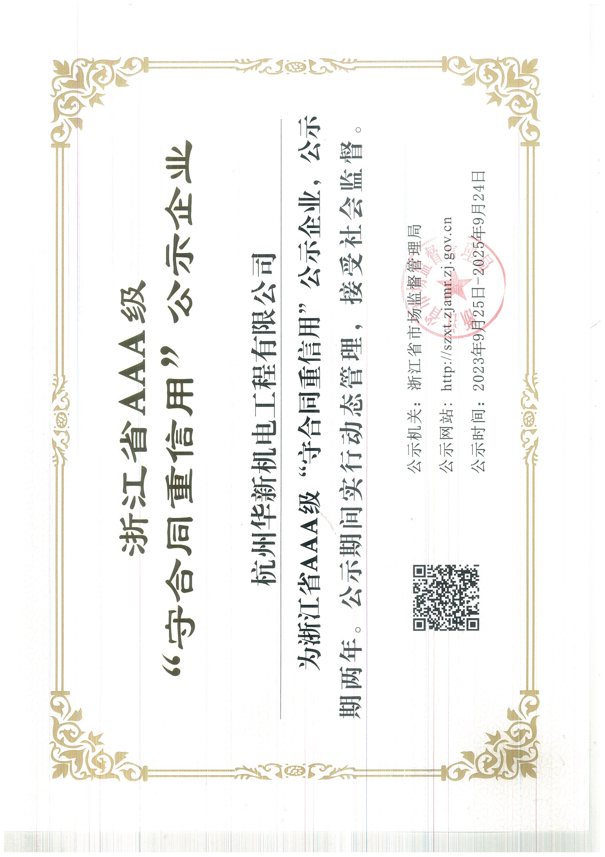 浙江省守合同重信用AAA级证书